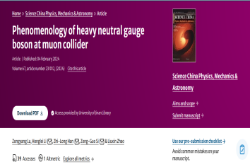 近日,粒子物理团队在知名期刊《Science China Physics, Mechanics & Astronomy》上发表了题为“Phenomenology of heavy neutral gauge boson at muon collider”的研究文章。SCPMA为中科院一区期刊,影响因子6.4。研究生芦宗洋担任第一作者,李洪蕾教授为员工导师兼通讯作者。