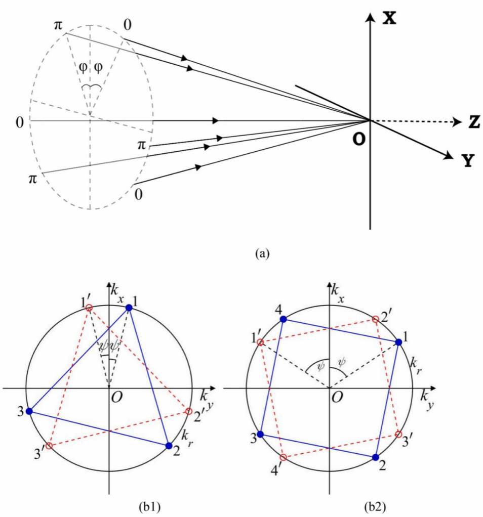 图1 (a) 六束准对称平面波干涉示意图;(b1)、(b2)六束或八束准对称平面波的横向傅里叶分量。六束或八束平面波可以分为两组对称平面波。