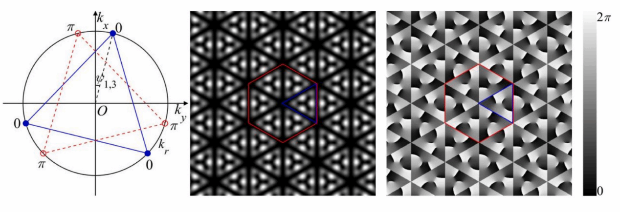 在这里,我们基于准对称结构,成功地实现了高拓扑荷高纯度的无衍射光学涡旋阵列的产生。通过六束准对称的平面波干涉,获得了拓扑荷为±2的三角形光学涡旋阵列,通过八束准对称的平面波干涉,获得了拓扑荷为±3的正方形光学涡旋阵列。