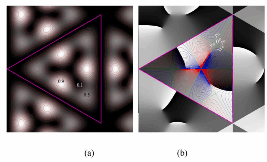 图2 (a) 六束准对称平面波的横向傅里叶分量的排布及相对初始相位;(b)、(c)六束准对称平面波干涉形成的三角形高拓扑荷光学涡旋阵列的强度分布及相位分布。