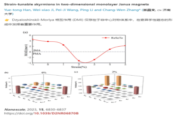 基于出色的阅读量和下载量表现,张昌文教授带领团队在Nanoscale上发表的论文“Strain-tunable skyrmions in two dimensional monolayer Janus magnets”,被编入Nanoscale2023年最受欢迎论文专辑,以及2024 Lunar New Year Collection 专辑。 Nanoscale是由英国皇家化学会同中国国家纳米科学中心共同出版,发表有关纳米科学和纳米技术的高质量研究报道,是领域内的一本主力期刊。论文的第一作者为2020级硕士研究生韩曰通同学,硕士毕业以后,在郑州大学物理公司继续攻读博士学位。