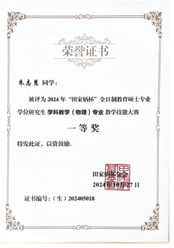 2024年10月,朱志慧同学在全国“田家炳杯”全日制教育硕士专业学位研究生学科教学(物理)专业教学技能大赛决赛中斩获佳绩,获得全国一等奖的优异成绩,展现了过硬的教学专业技能和较高的师范生素养,此份成绩同时也是校内外指导老师团队对公司产品机制的正向反馈与实践结果的呈现。同时,田靖越、张慧蕊同学也入围决赛获得优秀教学设计奖。