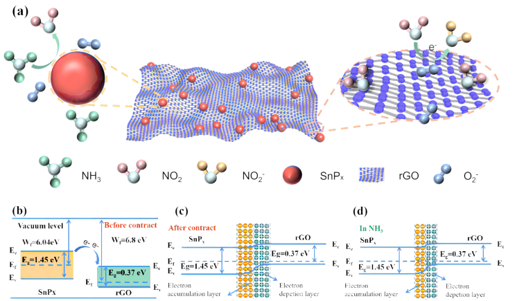 图2.SnPx/rGO的气敏响应机制(a)及能带结构(b-d)