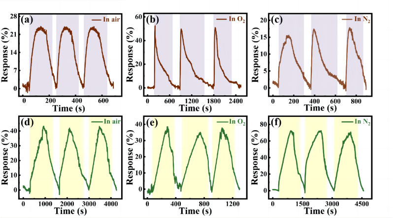 图3. 空气、O2和N2背景下SG-5对10 ppm NH3 (a-c)和10 ppm NO2 (d-f)的响应循环曲线。