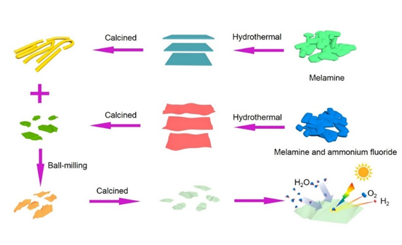 在这个工作中,最重要的是材料的制备:第一种碳氮材料,以三聚氰胺为原料,先进行水热合成处理(180 ℃,24h),接着过滤干燥,然后将材料转移到高纯氩气保护下的管式炉中,温度为550 ℃,保温时间为1 h; 第二种碳氮材料,将CN用三聚氰胺和氟化铵水热180℃处理24 h,过滤、干燥、煅烧(550 ℃,1 h); 目标产物,将上述两种碳氮材料按相等的比例混合后,高能球磨研磨,然后将其转移到管式炉中,气氛保护下淬火。