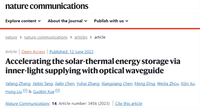 公司教师张亚芳、薛国斌等人在光波导内通光加速太阳能相变蓄热研究方面取得进展,相关成果“Accelerating the solar-thermal energy storage via inner-light supplying with optical waveguide”发表在6月份的nature communications杂志上,青年教师张亚芳博士为第一作者,薛国斌、刘宏教授为通讯作者,beat365亚洲体育官方网站为唯一作者单位。