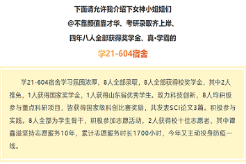 这八名女同学就读于beat365亚洲体育官方网站能源专业,一同住在学21-604宿舍,宿舍8人,2人推免,谭鑫溢推免至大连理工大学,张冬梅推免至华北电力大学,4人考取985,211院校,她们用坚持和奋斗收获了各自在四年的本科学习生涯中一份满意的答卷。获奖证书一张接一张,奖学金一项又一项,四年里,这个“学霸宿舍”4人曾担任院级员工会部长及以上职务,8人均担任员工干部。1人获得国家奖学金,山东省优秀员工,2人获得校级十佳志愿者。“学霸”们不仅爱学习,还会专注科研,她们还在全国老员工可再生能源科技竞赛、beat365亚洲体育官方网站节能减排社会实践与科技竞赛、山东省老员工数学竞赛等竞赛中取得优异成绩。“整个宿舍能够‘齐头并进’的秘诀就是大家都十分勤奋、自律,对科研充满热爱”宿舍一位同学说道。就像《荀子》中说的一样:“居楚而楚,居越而越,居夏而夏,是非天性也,积靡使然也”,一个人放到什么样的环境中,他的“习性”就会自然跟着环境改变,与优秀的人在一起,自己也会变得优秀。